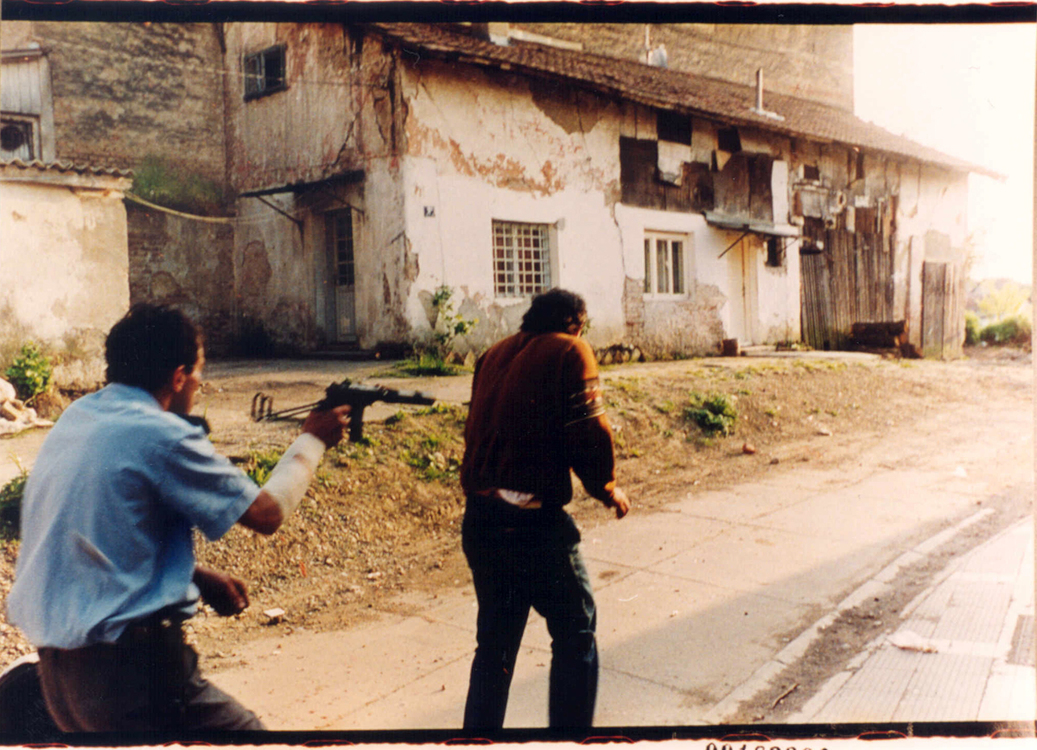 U centru su vidjeli dvojicu koji nekuda vode drugu dvojicu. Pitao je onog u policijskoj uniformi – kasnije će saznati da je to bio Jelisić – kamo ih vode. “Rekao je ‘Vodimo ih na svadbu’, i nacerio se”, prepričava Petrović. Kaže i da je Jelisić tada za čovjeka kojeg će uskoro ubiti dodao: “Ovo mi je 180 i neki, neka namirim dve stoje i idem kući.” Bili su na dva metra od njega, kaže Petrović. To kaže i širokokutni objektiv. Kada su počeli pucati, Srđan i Bojan su snimali. Kaže da su bili šokirani.