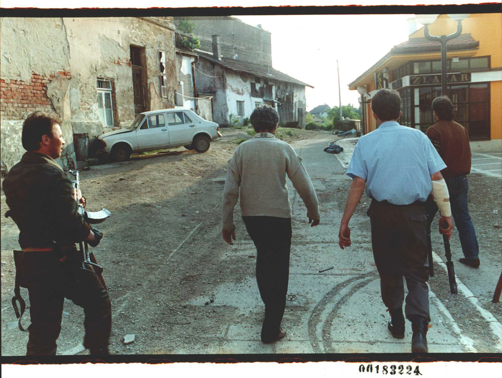 Na sljedećoj fotografiji je Jelisić uperio “škorpion” u leđa muškarca u smeđoj jakni. Obojici je glava uvučena u ramena i tijelo pogureno.