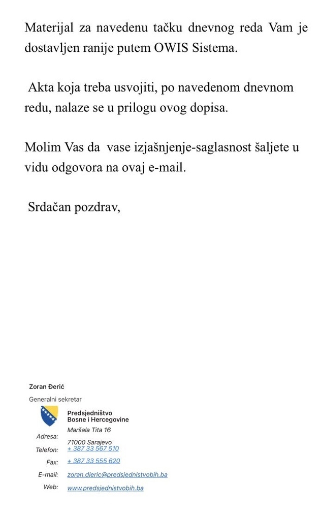 U ime Dodika glasao je njegov šef kabineta Danijel Dragičević. Kada se održavaju telefonske sjednice, to se najčešće održava putem emaila i to tako da kabineti razmjenjuju materijal, a pismeno se izjašnjavaju o tačkama dnevnog reda i taj stav se u Sekretarijatu Predsjedništva verifikuje kao zvaničan.
