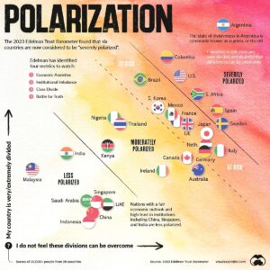 Povezano sa prethodnim kontekstom, autori Globalnog izvještaja Edelmanovog barometra istine (2023) uočili su i pokušali kvantificirati sve očigledniju društveno-političku polarizaciju u svijetu današnjice. Istraživanje pokazuje da su snažno polarizirane zemlje i one koje su na rizičnoj granici da postanu snažno polarizirane zemlje većinom države kolektivnog Zapada. Tako su SAD, Švedska i Španija snažno polarizirane države, a Francuska, Velika Britanija, Nizozemska, Italija i Njemačka su na rizičnoj granici da postanu snažno polarizirane države. Nedostatak povjerenja u institucije države, nedostatak zajedničkog identiteta, klasna nejednakost i „borba za istinu“ kao obilježje postčinjenične epohe transformirala je javni prostor Zapada u „eho-komore“ ostrašćenih neistomišljenika koji nastoje nametnuti svoje svjetonazore kao mjerilo stvarnosti.